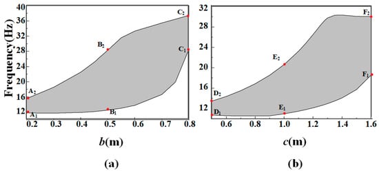Based on the preceding analysis, it is evident that the generation of a wide bandgap in the system originates from the local resonance of the chiral structure. Regarding the emergence of the bandgap, the chiral structure’s geometric parameters play a fundamental role. In the following section, we will analyze the effects of geometric parameters on the bandgap characteristics. When the value of the structure’s arm width b varies, while other parameters are maintained consistent with prior specifications, the effect on the bandgap width is depicted in Figure 4a. It is observed that both the lower and upper boundaries of the bandgap shift to higher frequencies as b increases. The upper boundary exhibits a more pronounced upward trend compared to the lower boundary, with the bandgap width coming to the largest when b is 0.6 m. In Figure 4b, we increase the structural arm length c while keeping other parameters constant. This causes both the upper and lower bandgap boundaries to shift upward progressively. Further increase reveals that the upward shift in the upper boundary tends to stabilize. The widest bandgap arises when c is 1.35 m. The progression pattern of these bandgaps indicates that the geometric parameters of the chiral structure exert a substantial influence on the location and width of bandgaps.