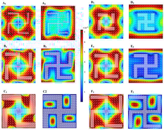 Vibration modes at the upper and lower boundaries of the bandgap when modifying parameters. The color represents the displacement amplitude, and the arrows on the surface indicate the direction of energy flow. The (A–C) group shows the cases where only parameter b is changed, and the (D–F) group shows the cases where only parameter c is changed. The mode with subscript 1 is at the lower boundary of the bandgap, and subscript 2 represents the mode at the upper boundary.