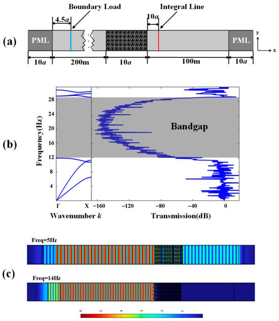 Next, we further verify the shielding results of the chiral SM by calculating the transmission coefficient of seismic wave propagation in a 2D finite system. Additionally, the incident and transmitted wave displacement field distributions are analyzed to demonstrate the shielding capability of the proposed SM. The model used in frequency domain calculations is a finite system composed of 50 unit cells sandwiched by two homogeneous parts of the soil, as shown in Figure 6a. The cells are arranged in a 2D array with 10 rows in the x-direction and five columns in the y-direction. The unit cell parameters are kept consistent with those mentioned above, as shown in Table 1 and Table 2. Perfectly matched layers (PMLs) are implemented at both ends along the x-direction to minimize reflections originating from the model domain boundaries. Periodic boundary conditions are imposed on the finite periodic composite in the y-direction. A specified displacement is applied as a line source on the left side of the model to excite incident waves, which is marked as a blue line in Figure 6a. The wave is captured at the red line after passing through the structures.