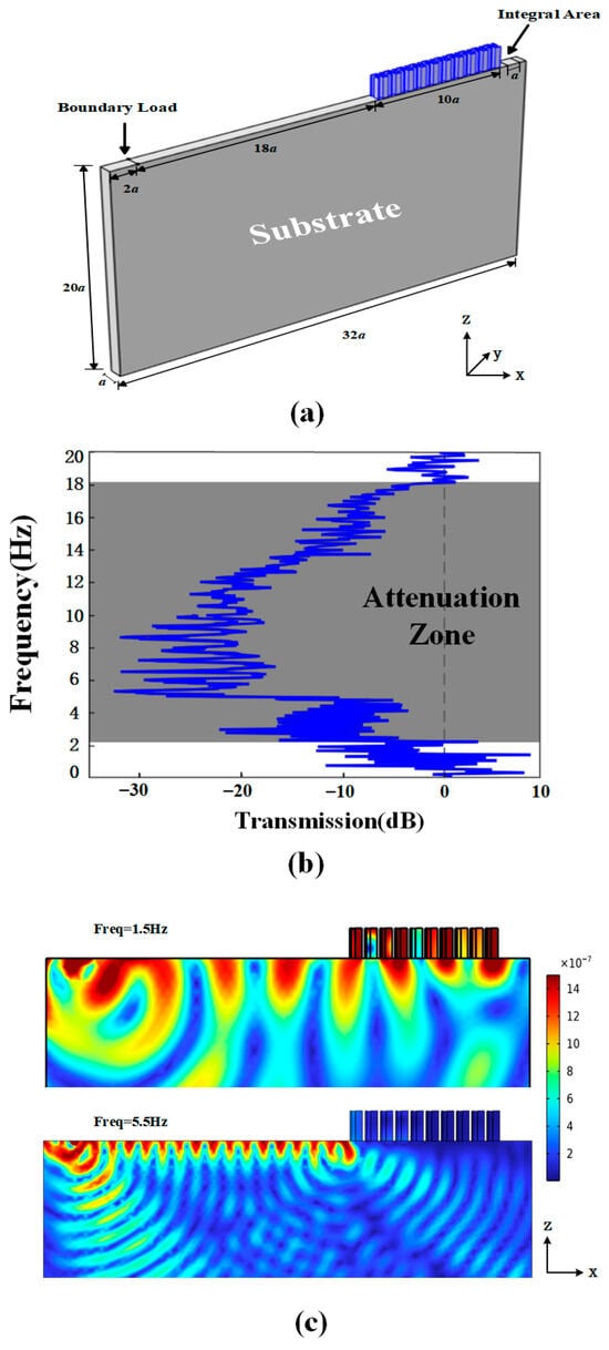 The simulation assumes perfectly bonded connections between pillar structures and the substrate. In practice, interfaces between samples and soil involve minute gaps or slippage, leading to more complex energy dissipation mechanisms than the theoretical model. This may enhance the attenuation of low-frequency vibrational energy.