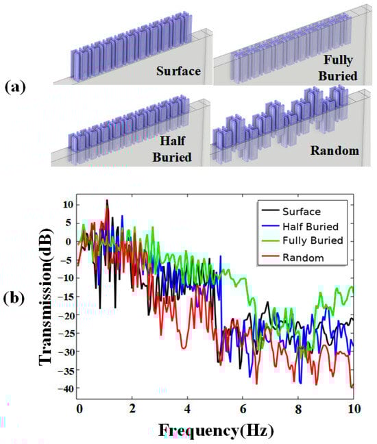 As shown in Figure 8a, we modify the depth of the pillar insertion into the ground based on Figure 7a. To comprehensively simulate various scenarios, we test multiple cases with half-buried underground, fully buried, not buried, and buried at random depths. The transmission spectrum calculation results are shown in Figure 8b. In the cases of partial insertion with different depths, the insertion depth has a negligible impact on the transmission spectrum; only when fully buried will it have a slight effect on the result. Introducing randomness can even result in slightly better outcomes. However, overall, these slight differences do not affect the attenuation effect of the structure. The results demonstrate that the insertion depth only has a tiny impact on the effectiveness of the structures in attenuating waves, and the structures exhibit good robustness. For simplicity of calculation, the influence of insertion depth will no longer be considered in subsequent experiments.