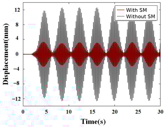 To further validate the shielding effect of our proposed 3D SM for Rayleigh waves, a time-transient harmonic analysis is conducted. The computed model is the same as that in Figure 7a, where an amplitude modulation (AM) wave source in the z-direction is applied as the boundary load, and the attenuated displacements are collected in the integral region behind the structures. The wave source emits a 5 Hz amplitude-modulated wave with 19-cycle Hanning-shaped modulation, active for 30 s. To highlight the attenuation effects, the displacements without and with the SM structures are overlaid on the same graph for comparison, in which the black line is the displacement without SM, and the red line is the displacement with SM, as shown in Figure 9. It can be seen that the SM has a very significant attenuation effect with a 76.45% attenuation at the peaks.