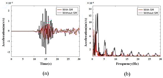 Dynamic response of the excitation signal: (a) temporal response of the seismic wave; (b) spectral response of the seismic wave. The black curves represent cases without SM, and the red ones depict results with SM attenuation.