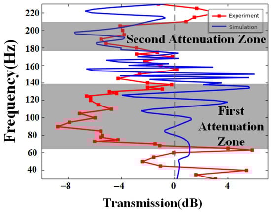 Meanwhile, the corresponding numerical simulations are performed to match the experimental model, whose computed model is shown in Figure 12d, with the same dimensions as the experimental equipment. The transmission spectrum is shown in Figure 13, with numerical simulation results of this model also overlaid as a comparison. The first attenuation zone exists in the frequency range of 63–138 Hz, which shows a significant attenuation, even better than the simulation results. The second attenuation zone in the range of 175–210 Hz is in good agreement with the simulation results, and the attenuation effect is also obvious.