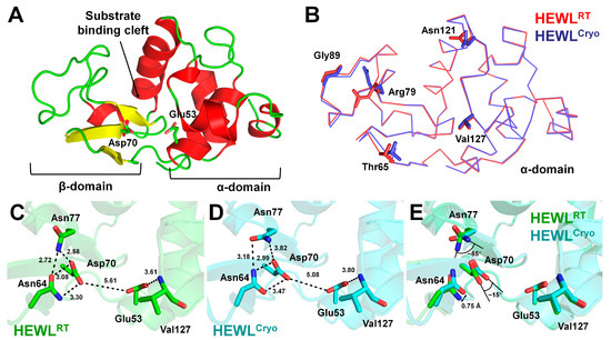 Superposition of HEWLRT and HEWLCryo revealed significant conformational and positional changes in the vicinity of the residue involved in the catalytic residue Asp70. The rotation angles of the Glu53 and Asp70 side chains of HEWLRT and HEWLCryo were approximately 4° and 15°, respectively (Figure 1E). The position of the side chain of Asn64 of HEWLRT and HEWLCryo were apart by 0.75 Å. The temperature induced the conformation and position change of the active site region on the β-domain in HEWL. The distance between the substrate-binding cleft and the distance between catalytic residues of HEWLRT were wider than those of HEWLCryo.
