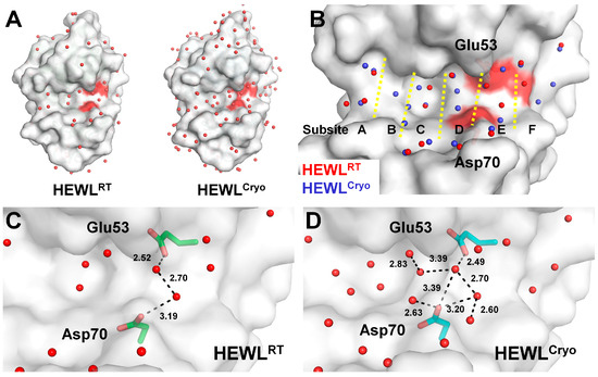 Comparison of water molecules on HEWLRT and HEWLCryo. (A) Defined water molecules on the surface structure of HEWLRT and HEWLCryo. (B) Superimposition of water molecules on the substrate-binding cleft of HEWLRT and HEWLCryo. Water molecule interactions with the catalytic Glu53 and Asp70 residues of (C) HEWLRT and (D) HEWLCryo.