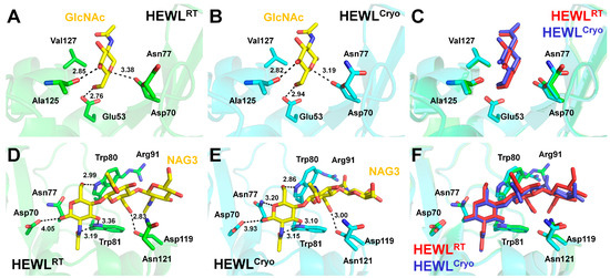 Computational docking of GlcNAc and NAG3 to HEWLRT and HEWLCryo. GlcNAc docking to (A) HEWLRT and (B) HEWLCryo. (C) Superimposition of GlcNAc docking structures of HEWLRT (red stick) and HEWLCryo (blue stick). NAG3 docking to (D) HEWLRT and (E) HEWLCryo. (F) Superimposition of NAG3 docking structures of HEWLRT (red stick) and HEWLCryo (blue stick).