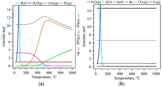 For the compounds used in the synthesis process (glucose and urea), thermodynamic calculations of the equilibrium composition of the system suggest that ammonia, carbon monoxide, and methane will be formed during thermolysis (Equations (8)–(10)). These pyrolysis gases, as discussed earlier, act as active reducing agents for rhenium oxides.