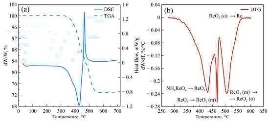 Figure 2b) revealed four distinct sections with varying rates of mass change, which became more pronounced when plotting the rate of mass change (differential thermal gravimetric analysis—DTG). These results suggest four main processes during the decomposition of ammonium perrhenate in argon, including the formation of rhenium trioxide, its further decomposition to rhenium dioxide, the polymorphic transformation of ReO