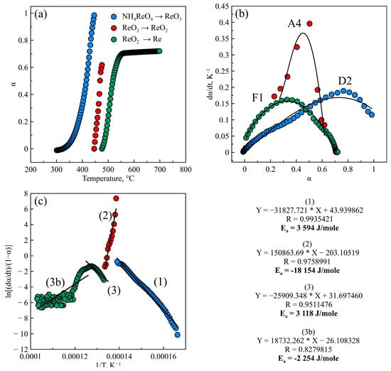 The first two processes exhibit a nearly linear relationship, which supports the validity of the selected models. Notably, the activation energy for the decomposition of ammonium perrhenate to rhenium trioxide is positive (3.6 kJ/mol), whereas the formation of rhenium dioxide is associated with a negative activation energy (−18.2 kJ/mol). The latter process involves the polymorphic transformation of rhenium dioxide from its low-temperature monoclinic form to the high-temperature orthorhombic phase, which is also well-described by a linear relationship. In contrast, the oxygen release into the gas phase is less accurately described, likely due to the simultaneous reduction of both rhenium dioxide phases (