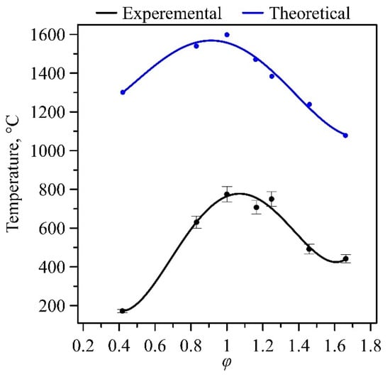 Figure 5). The discrepancy between the experimental and theoretical temperature values can be attributed to heat losses through the end part and walls of the glass container during combustion [