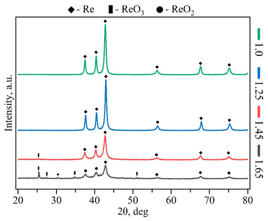 Figure 6). In contrast, with increasing fuel content, i.e., a more reducing atmosphere during combustion, the intensity of the diffraction peaks decreased, accompanied by a reduction in combustion temperature. Additionally, diffraction peaks associated with impurity rhenium oxides (ReO