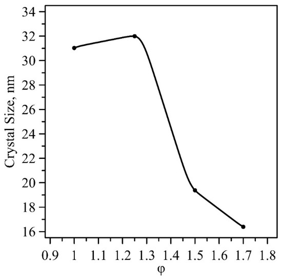 Figure 10). The microstructure exhibited a notable increase in porosity with higher fuel content, corresponding to increased oxidizer-to-fuel ratios (φ values). This trend is attributed to the larger volumes of gas released during combustion, resulting from the higher content of organic compounds in the precursor solution.