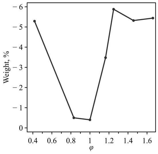 Figure 8). In contrast, for samples near the stoichiometric ratio (φ = 1), the mass loss did not exceed 0.5%, indicating minimal organic impurities. Notably, the high temperature of the process was not a fundamental requirement for achieving a low organic impurity content. The combustion temperature at φ = 1.25, for example, was higher than that at φ = 0.8. A small fuel shortage (φ slightly less than 1) resulted in better outcomes for the synthesis of metallic rhenium, in contrast with the other metals studied [