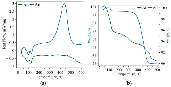 4 in argon revealed the absence of adsorbed moisture, as indicated by the constant mass of the sample between 25 and 300 °C. Two significant thermal events were observed: an endothermic peak at 428 °C and an exothermic peak at 465 °C. Additionally, two smaller effects were observed, corresponding to slight inflections on the DSC curve at 385 °C (endothermic) and 513 °C (exothermic) (