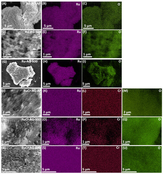Scanning electron microscopy (SEM) images and energy-dispersive X-ray spectroscopy (EDS) mapping of (A–C) Ru-AG-AP, (D–F) Ru-AG-500, (G–I) Ru-AG-600, (J–M) RuCr-AG-AP, (N–Q) RuCr-AG-500, and (R–U) RuCr-AG-600. Colors for EDS mapping for Ru (purple), Cr (brown) and O (green) were used for visualization of the different elements).