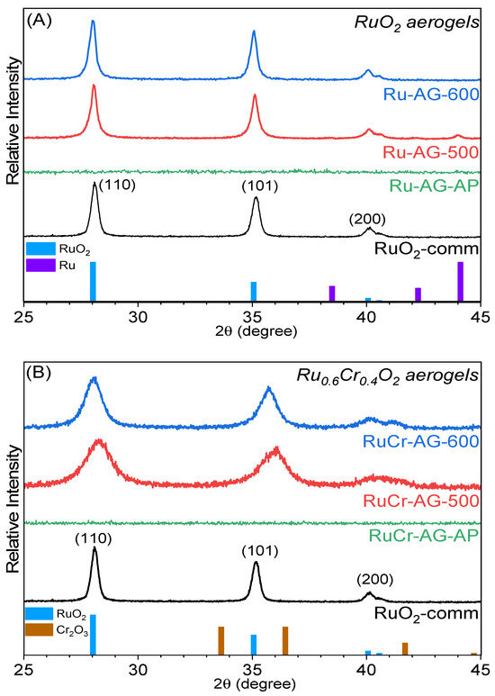 X-ray diffraction patterns in the 2θ = 25–45° range for (A) Ru oxide aerogels and reference patterns: RuO2-comm (commercial RuO2), Ru-AG-AP (as-prepared Ru oxide aerogel), Ru-AG-500 (Ru oxide aerogel treated at 500 °C), and Ru-AG-600 (Ru oxide aerogel treated at 600 °C); (B) Ru-Cr oxide aerogels: RuO2-comm, RuCr-AG-AP (as-prepared Ru-Cr oxide aerogel), RuCr-AG-500 (Ru-Cr oxide aerogel treated at 500 °C), and RuCr-AG-600 (Ru-Cr oxide aerogel treated at 600 °C). Miller indices for rutile RuO2 are included. Reference diffraction patterns for reference compounds: RuO2 (rutile; PDF: 01-071-4825), Cr2O3 (trigonal; PDF: 38-1479), and metallic Ru (hexagonal; PDF 06-0663).