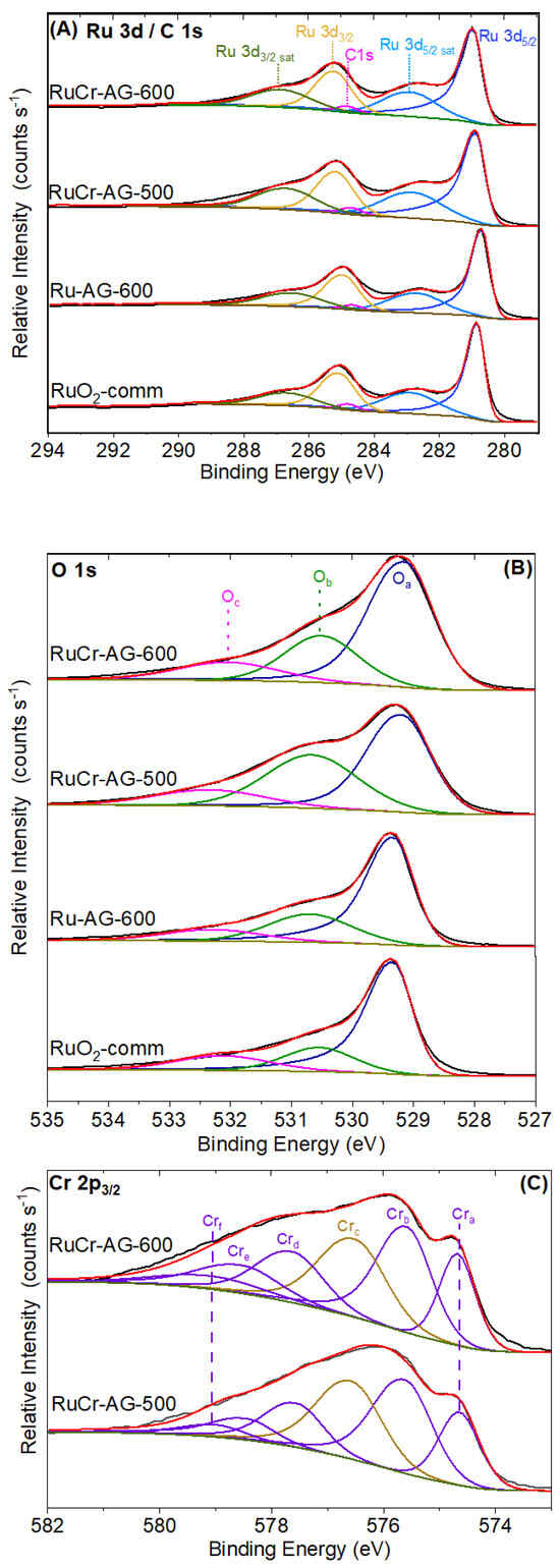 X-ray photoelectron spectroscopy (XPS) spectra of Ru-AG-600 (Ru oxide aerogel treated at 600 °C), RuCr-AG-500 (Ru-Cr oxide aerogel treated at 500 °C), RuCr-AG-600 (Ru-Cr oxide aerogel treated at 600 °C), and RuO2-comm (commercial RuO2) in the (A) Ru 3d/C1s region and (B) O1s region; (C) XPS spectra of RuCr-AG-500 and RuCr-AG-600 in the Cr 2p region.
