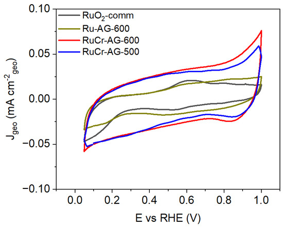 Cyclic voltammograms of RuO2-comm, Ru-AG-600, RuCr-AG-500, and RuCr-AG-600 after initial conditioning step; 30th cycle shown.