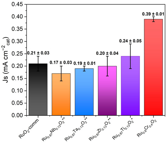 To understand the effect of Cr substitution into rutile RuO2 compared to metal substitution, we compared the specific activity of the Ru-Cr oxide aerogel (RuCr-AG-600) with the specific activities of Ti-, Zr-, Nb-, and Ta-substituted RuO2 from our prior studies [20,21]. Cr-substituted RuO2 exhibited a higher specific activity than Ti-, Zr-, Nb-, and Ta-substituted RuO2 (Figure 8). Cr was the only metal substituent from this comparison that enhanced the OER specific activity relative to RuO2-comm. Chromium is an interesting substituent, as it has a number of possible oxidation states, with Cr3+ and Cr6+ being the most pronounced [71]. From our XPS analysis described above, the substituted Cr existed in a +3 oxidation state in the synthesized Ru-Cr oxide aerogels; however, under the high applied potentials of the oxygen evolution reaction, we consider that is it possible that the Cr substituent could adopt a higher oxidation state (Cr6+) than these other metal substituents (Ti4+, Zr4+, Nb5+, and Ta5+). Previous calculations of Cr-substituted RuO2 considered the presence of Cr6+ to explain higher OER activity [27], and prior studies of chromium-doped cobalt–iron hydroxide alkaline OER catalysts reported the presence of Cr6+ after electrochemical testing [72,73]. However, the presence of Cr6+ under OER reaction conditions needs to be experimentally confirmed. The specific effects of Cr substitution within RuO2 on OER activity need to be further studied, as we also note that numerous factors including the metal substitution ratio, synthesis method, thermal treatments, surface structure, electronic conductivity, and pore structure can influence the OER activity.