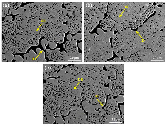 Figure 5 shows the SEM microstructure of the AlCuCrFe2NiTi0.25 high-entropy alloy after solid solution treatment at 1200 °C for 2 h, 3 h, and 4 h. The microstructure of the AlCuCrFe2NiTi0.25 high entropy surfacing alloy exhibits a typical dendritic structure, with gray dendritic (DR) regions and black interdendritic (ID) regions. From Figure 5a, it can be seen that after 2 h of solid solution treatment, there are some black particles distributed on the surface of the alloy, and relatively small dendritic crystals can still be observed. From Figure 5b,c, it can be seen that as the solution treatment time increases, the distribution of black dots becomes more uniform and their number gradually decreases. When the solution treatment time reaches 4 h, the black-dot-like substance gradually disperses into the interior of the particles, and the distribution becomes more uniform. The decrease in the number of black-dot-like substances indicates that the second phase dissolves back into the matrix after solid solution treatment [17].