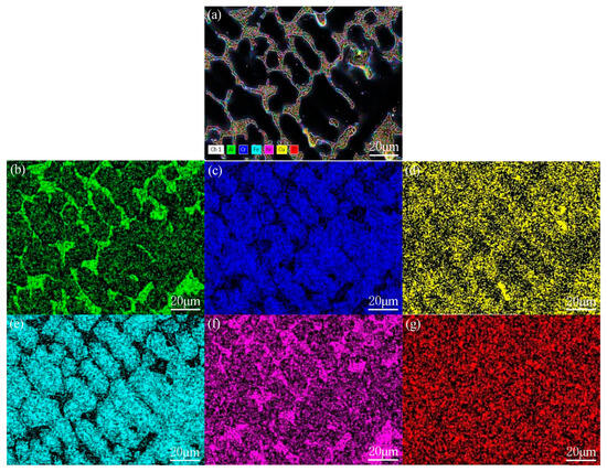 Element surface scan of AlCrCuFe2NiTi0.25 high-entropy alloy: (a) microstructure; (b) Al; (c) Cr; (d) Cu; (e) Fe; (f) Ni; (g) Ti.