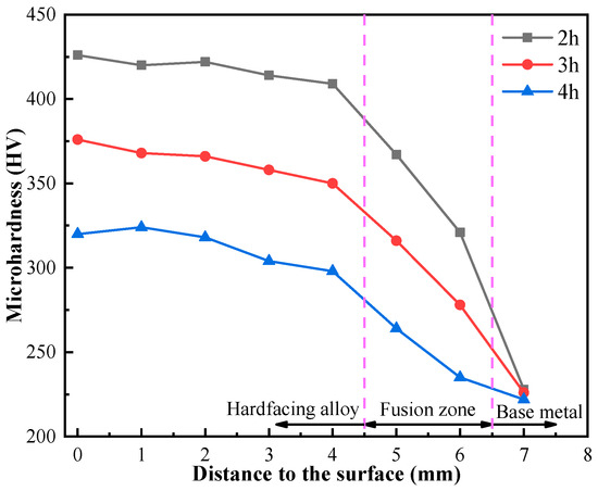 Figure 7 shows the cross-section microhardness curve of the AlCuCrFe2NiTi0.25 high-entropy alloy. As the solution treatment time increases, the cross-section microhardness of high-entropy alloys gradually decreases from the top to the base metal. The total thickness of the weld overlay is about 5 mm, and the surface microhardness is about twice that of the substrate. The fusion zone is located in the transition zone between the hardfacing alloy and the base metal. Due to the high heat flux during welding, the base metal is diluted, resulting in the microhardness of the fusion zone always being between the hardfacing alloy and the base metal [18].