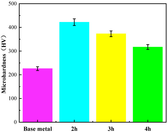 Figure 8 shows the average surface hardness of the AlCuCrFe2NiTi0.25 high-entropy alloy after 2 h, 3 h, and 4 h of solid solution treatment at 1200 °C. It can be seen from the figure that the average hardness of the alloy after 2 h, 3 h, and 4 h of solid solution treatment is 422 HV, 373 HV, and 317 HV, respectively. From this, it can be seen that with the increase in solution treatment time, the increase in atomic activity at grain boundaries leads to a tendency for grain growth, and the hardness of AlCuCrFe2NiTi0.25 high-entropy alloy gradually decreases. According to XRD results, as the solution treatment time increases, the number of BCC phases gradually decreases, the number of FCC phases gradually increases, and the Laves phase re-dissolves into the matrix, resulting in a continuous decrease in its quantity. Among them, the BCC phase and Laves phase belong to the hard phase, and the FCC phase belongs to the soft tough phase [19]. Therefore, with the increase in solution treatment time, the hardness of the alloy continues to decrease. The change in hardness is consistent with the results obtained from XRD. The microstructure of the high-entropy alloy under scanning electron microscopy also shows that with the increase in solution treatment time, the equiaxed grains gradually become smaller and the grain size becomes more uniform. The precipitates inside the equiaxed grains gradually dissolve back into the matrix with the increase in solution treatment time, resulting in a decrease in the hardness of the alloy [20].