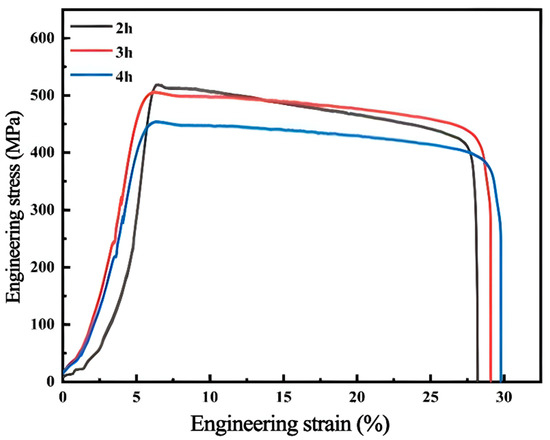 Figure 9 shows the stress–strain curves of the AlCuCrFe2NiTi0.25 high-entropy alloy under room temperature tensile engineering at 1200 °C for 2 h, 3 h, and 4 h. After 2 h of solid solution treatment, the tensile strength of the alloy was 516 MPa and the elongation was 19.9%; after 3 h of solid solution treatment, the tensile strength and elongation of the alloy were 509 MPa and 23.8%, respectively; when the solution treatment time increased to 4 h, the tensile strength of the alloy was 454 MPa and the elongation was 24.2%. According to the data obtained from room temperature tensile experiments, as the solution treatment time increases, the tensile strength of the AlCuCrFe2NiTi0.25 high-entropy alloy decreases, while the elongation rate continues to increase. From this, it can be seen that the solution treatment system can improve the plasticity of the AlCuCrFe2NiTi0.25 high-entropy alloy. The tensile strength after 4 h of solution treatment only decreased by 62 MPa compared to 2 h, and the elongation increased by 4.3%.