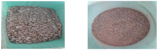 (1) Cement: 42.5 ordinary Portland cement is used. All cement chemical composition tables are shown in Table 1. (2) Recycled aggregate: All materials are made of self-made recycled aggregate, and the aggregate is well-proportioned. Recycled coarse aggregate’s void ratio and apparent density are 50.43% and 2486 kg/m3. All prepared recycled aggregates are shown in Figure 1. (3) Natural coarse aggregate: Natural coarse aggregate is crushed stone provided by a commercial concrete company in Lanzhou. The performance indicators of the natural aggregates used are shown in Table 2. (4) Water. (5) Waste ceramic particles: the performance indicators of ceramic particles and recycled fine aggregates are shown in Table 3. (6) Admixture: An SBTMJD-type high-efficiency water reducer was selected for the experiment, with a water reduction rate of 23% and a dosage of 2.5% of the total amount. The flowability of each group of specimens was good, and the slump was guaranteed to be within the range of 130 mm–180 mm.