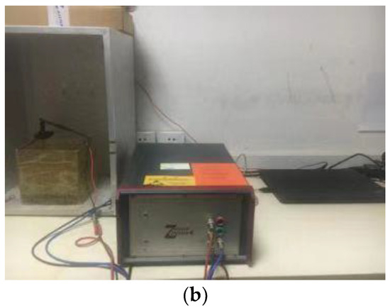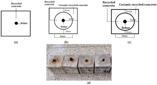 Four specimen groups are established for the test: the first group comprises internal recycled concrete 60 mm in size; the second group consists of internal recycled concrete 70 mm in size. Each specimen group maintains a perpendicular distance of 50 mm between the boundary of the external ceramic recycled concrete and the center of the inside recycled concrete circle. The third and fourth sets of specimens consist of standard recycled concrete examples. To mitigate the corrosion of exposed steel bars during the usual curing process, the specimens are demolded after 24 h of curing to eliminate the impact of corrosion on the test. Copper wires are then wound around the exposed steel rods and wax-sealed. The schematic diagram and physical figure of specimens are illustrated in Figure 2.