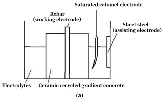 Polarization curves of the internal reinforcement in the initial state of four groups of specimens that are standardly cured for 28 d are determined by using a CS350 electrochemical workstation before the test. A saturated KCl calomel electrode is selected as the reference electrode, and the reinforcement in the concrete specimens is used as the working electrode as shown in Figure 3. Subsequently, three sets of specimens with various sizes (N-60, N-70, and N-0) are placed in soil taken from a salt lake area in Qinghai Province, and then a set of recycled concrete specimens (N) is placed in the natural environment of the soil as a control group with N-0. The soil is tested to contain aggressive ions such as Cl−, SO42−, Mg2+, and HCO−, with the maximum content of Cl−, and SO42−, and the concentration of corrosive ions in the soil is about 10%. Three groups of ceramic regeneration gradient reinforced concrete specimens are used as anodes, and carbon rods with a diameter of 12 mm are taken as cathodes. A PS−3002d II DC power supply with a range of 5 V and 3 A is used for constant current energization. A constant current is set as 20 mA and a current density is set as 200 μA/cm2. To accurately control the moment of cracking of the specimen, strain gauges are pasted on the two end surfaces perpendicular to the axial orientation of the reinforcement of the specimen, and the concrete strains around the reinforcement are controlled. The concrete strain around the rebar is controlled, and when the strain changes abruptly, the strain collector issues a command to cut off the power supply and halt the rusting of the rebar. For group N specimens, based on the group’s current research on recycled concrete, recycled concrete in salty soil field exposure conditions has an average of about 550 d to destruction [10]. Therefore, for this test, at the beginning of the 540 d, specimens were checked daily for crack detection to determine the specimen cracking time. The polarization curves of the internal reinforcement of each specimen at the time of concrete fracture are again determined using a CS350 electrochemical workstation. The measurement scan rate is 0.167 mV/s, and the scanning range is relative corrosion potential −0.1–0.1 V [12,13]. Referring to GB/T50344−2004 “Technical Standard for Building Structure Inspection” [14], the corrosion of steel bars is tested. The concrete specimens are destroyed; the corroded steel bars are removed; and the corroded materials are bagged for scanning electron microscopy (SEM) (Prusai Instrument Manufacturing Company, Beijing, China) and X-ray diffraction to determine the components of the corroded materials, and the expansion rate of the corroded materials of the reinforcement bars at the time of failure of each group of specimens is calculated by the Eighted-Averaging model.