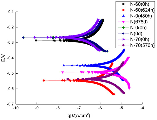 During the test, group N specimens crack after 676 d under natural conditions, and N−0, N−60, and N−70 specimens produce cracks after 480 h, 624 h, and 576 h of energization, respectively. The polarization curves of each steel bar at the time of cracking of the specimens are detected and compared with their initial state as shown in Figure 4, and the polarization curve fitting parameters are shown in Table 6.