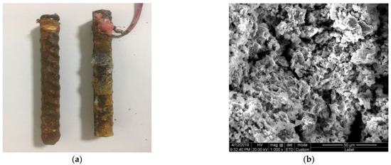 When cracks are generated in the specimen, the energization is halted; the corroded bars are removed; and the corrosion products on the surface of the bars are collected. The composition of the sample taken is evaluated by employing electron microscope scanning and XPS energy spectroscopy (ULVCA–PHI, New York, NY, USA), along with XPS energy spectroscopy analysis data of our group’s corrosion products. The macroscopic view of the corroded steel bar and the microscopic picture of the corrosion products and XPS energy spectra are displayed in Figure 5.