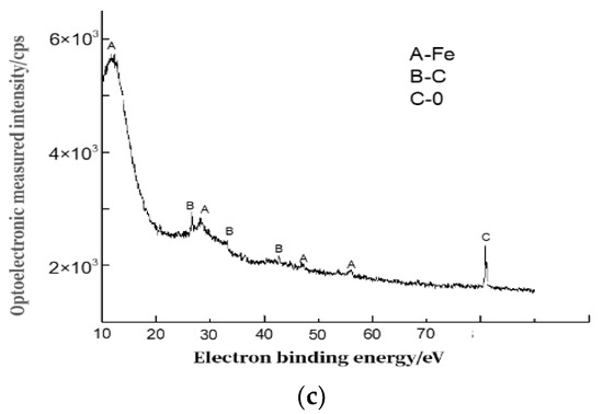 As can be seen in Figure 5, there are reddish-brown loose corrosion products on the surface of the corroded steel bar, and its microscopic morphology is an irregular flake structure with a rough surface; after removing the red corrosion products on the surface, there is a layer of relatively dense black products close to the surface of the steel bar. From the XPS spectra of corrosion products, it can be found that the corrosion products are predominantly made of Fe, O, and C. Combined with XPS spectral analysis of the corrosion products of steel bars by this group, the Fe in the corrosion products mainly exists in the form of divalent (Fe2+) and trivalent (Fe3+) ions, and the O exists primarily in the form of C−O bonds and Fe−O bonds, and it can be deduced that the composition of corrosion products is as follows: FeOOH, Fe3O4, and Fe2O3. Through comparison with the literature [16], the corrosion products produced by the energization test and the composition of the corrosion products of the rebar in the natural environment are basically the same, which can reflect that the energization accelerated test can be a better response to the corrosion of the rebar in natural conditions.