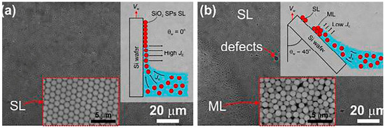 SEM images of dip-coating experiments carried out at θw of (a) 0° and (b) 45°. Insets: 2D schematic illustrations of the dip-coating conditions (top right), higher-magnification SEM images of SL and ML regions (bottom). Reprinted with permission from Ref. [71]. Copyright 2020, Wiley.