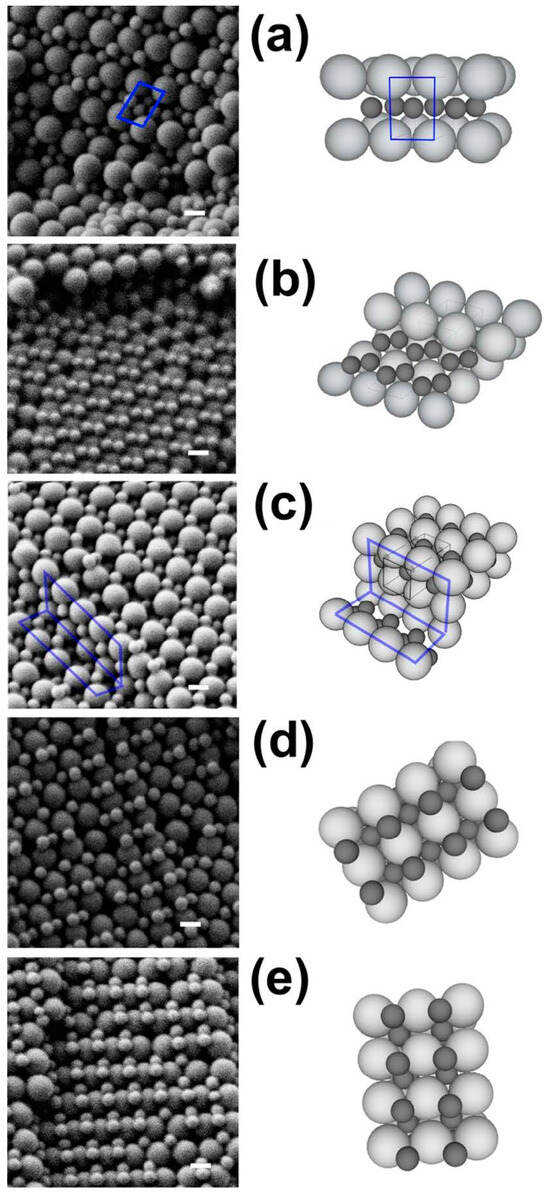 SEM micrographs and schematic of the crystal lattice for different ordered binary phases obtained via centrifugation: (a) layered structure akin to AlB2; (b) distorted AlB2 structure; (c) the tetragonal A3B variant; the tetragonal A2B variant before (d) and after distortion (e). Scale bars = 200 nm. Reprinted with permission from Ref. [79]. Copyright 2015, Wiley.