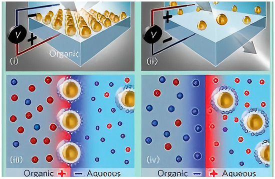 Similarly, the lattice parameters of electric-field-responsive photocrystals change with changes in the applied electric field, leading to changes in the reflected wavelengths. Functionalized PS microspheres prepared by Song et al. formed a defect-free photocrystalline structure under the bridging effect of silver nanoparticles. Because of the negative charge of the microspheres, disordered microspheres in solution under the action of an electric field were deposited in the conductive region of the electrode to develop color, making the pattern in the insulating region of the electrode visible to the naked eye [107].
