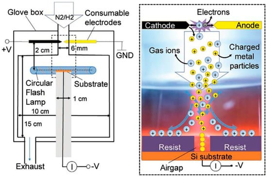 Under an applied electric field, the colloidal microspheres self-assemble to form ordered structures. Li et al. utilized the electrophoretic phenomenon of colloids to control the settling rate. They applied an electric field to the microsphere dispersion and accelerated or slowed the settling process of charged microspheres by changing the magnitude and direction of the applied electric field [81]. Liu et al. used two pieces of ITO conductive glass parallel to each other as electrodes to which a stable voltage was applied, and negatively charged PS microspheres dispersed in an aqueous–ethanol system were rapidly deposited on the ITO conductive glass under the action of the electric field. Although this method is faster, it is poorly ordered [82]. Wang prepared ultrathin microlattice colloidal gold thin films on a conductive platform using a combination of micro-transfer molding and electrophoretic deposition. The nanostructures and microstructures of the films were characterized using atomic force microscopy and SEM, and the optical properties of the films were tested, which showed that these patterned films can be used as transmissive two-dimensional optical diffraction gratings [83]. Schlag introduced an electrospraying technique to prepare three-dimensional ordered SiO2 nanostructures, described the required experimental steps and deposition parameters, and discussed the shape as a function of the gas flow rate and plasma power (see Figure 7). They found that a high-voltage electric field was necessary for the assembly of SiO2 nanospheres on the substrate during the drying phase [84]. Mohapi chose a strongly adsorbed fluoride ionic surfactant for charge-induced crystallization and a surfactant concentration below the critical micellar concentration. The surfactant molecules were partially adsorbed on the surface of the particles, leading to an increase in charged particles, while the remaining surfactant molecules remained in the water, leading to an increase in the Coulombic medium. Figure 8 provides a schematic overview of the customized reactor used as well as a close-up view of the principle of working through interconnected localized gas phase electrodeposition. The researcher verified the crystallization mechanism of the adsorption onto silica particles using poly(ethylene oxide) phenylnonyl ether and sodium n-octadecyl sulfate. The results showed that various colloidal particles, hydrophobic polymers, hydrophilic metal oxides, and metal particles crystallized upon cooling, owing to the adsorption of ionic surfactants [85].