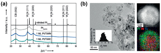 (a) PXRD analysis comparing 1 ML Pt/TiWN and Ptcomm before and after nitridation, (b) TEM image, particle size distribution, and STEM-EDX map of Pt/TiWN. Reproduced with permission. Copyright 2017, Wiley-VCH [26].