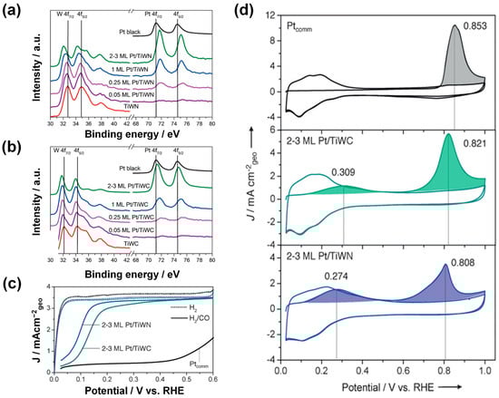 XPS results for the core level shifts for W 4f and Pt 4f binding energies in (a) Pt/TiWN and (b) Pt/TiWC at different Pt coverages. (c) HOR polarization curves at 1600 rpm in 0.1 M HClO4 saturated with H2, with/without 1000 ppm CO. (d) CO stripping voltammograms at 1600 rpm in Ar-saturated 0.1 M HClO4 after saturation with CO at 0.025 V versus reversible hydrogen electrode (RHE). Reproduced with permission. Copyright 2017, Wiley-VCH [26].