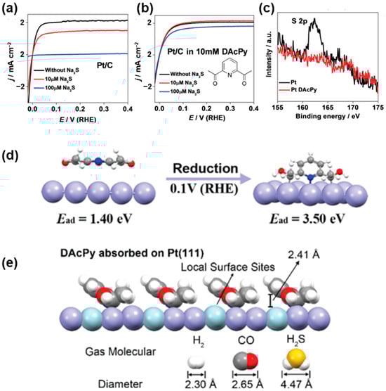 HOR polarization curves of commercial Pt/C (a) in 0.5 M H2SO4, (b) and 0.5 M H2SO4 + 10 mM DAcPy. (c) XPS of Pt foils poisoned by 10 μM Na2S with/with DAcPy adaptation. (d) DFT calculation of adsorption structure of DAcY on Pt(111). (e) The proposed model of the reduced form of DAcPy adsorbed on Pt(111) from the side. Reproduced from Ref. [36] with permission from the Royal Society of Chemistry.