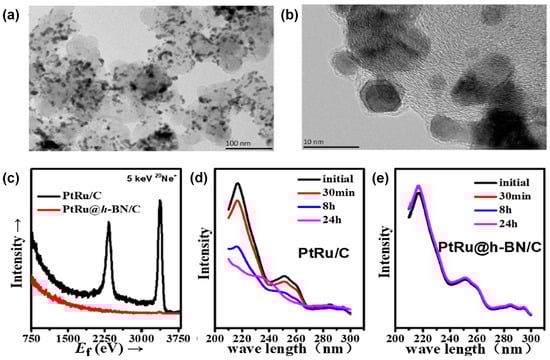(a) TEM (b) and HRTEM image of PtRu@h-BN/C comparing PtRu/C and PtRu@h-BN/C with (c) HS-LEIS spectra and (d,e) UV–Vis absorption spectra of benzothiazole in solution. Reproduced with permission. Copyright 2018, Elsevier [44].