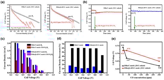In a CO tolerance durability experiment, the PtRu@h-BN/C catalyst demonstrated strong CO-tolerance in the fuel cell applications. As shown in Figure 6a,b, the single cell employing the PtRu/C anode catalyst manifested noticeable CO poisoning in contrast to the cell utilizing the PtRu@h-BN/C anode.