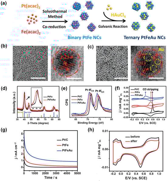 A ternary electrocatalyst comprising surface Au-decorated PtFe nanocrystals (NCs) (Figure 7a) was synthesized using a one-pot solvothermal method to form binary PtFe NCs, followed by a cation redox reaction in the presence of Au3+. The structural analysis was evaluated by HR-TEM and XRD (Figure 7b–d), confirming successful Au alloying. The TEM and HR-TEM images (Figure 7b,c) demonstrated the mono-dispersity of the binary PtFe NCs with an average particle size of around 3.2 nm. Subsequent galvanic reaction between Fe and Au3+ preserved the size and morphology of the resulting PtFeAu NCs, where the discontinuity in the PtFeAu lattice indicated the introduction of Au atoms at the surface.