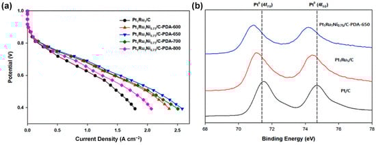 (a) MEA performance of the Pt1Ru1Ni0.75/C-PDA at different heating temperatures. (b) XPS of Pt 4f. Reproduced with permission. Copyright 2021, Elsevier [54].