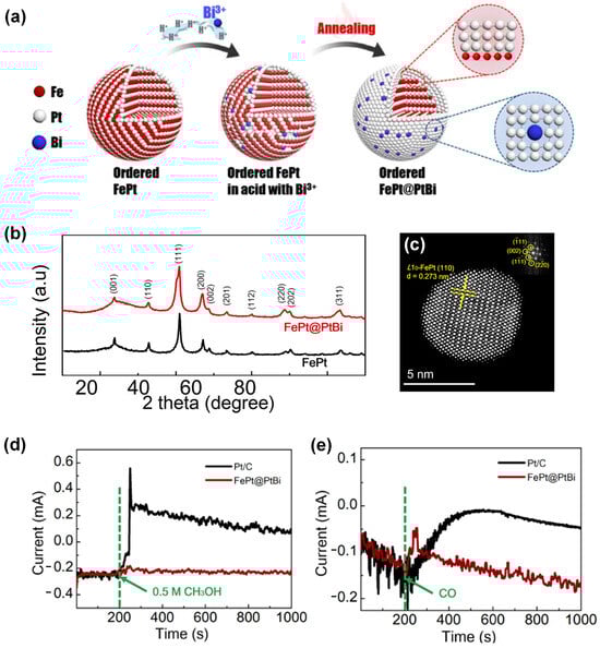 (a) Synthesis procedure of FePt@PtBi. (b) XRD of FePt and FePt@PtBi. (c) HAADF-STEM image of L10-FePt (inset: fast Fourier transform of interior). Chronoamperometric responses of commercial Pt/C and FePt@PtBi adjusted electrodes (d) by adding 0.5 M CH3OH and (e) CO into an O2 saturated 0.1 M HClO4 solution. Reproduced with permission. Copyright 2021, Wiley-VCH [58].
