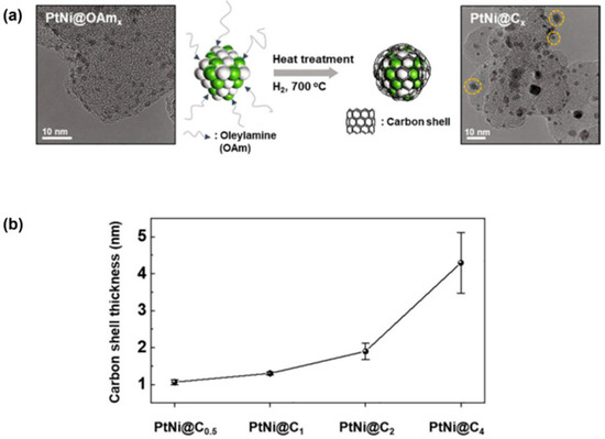 (a) Synthesis procedure. (b) PtNi@Cx NPs carbon shell thickness according to different C content. Reproduced with permission. Copyright 2022, Elsevier [60].