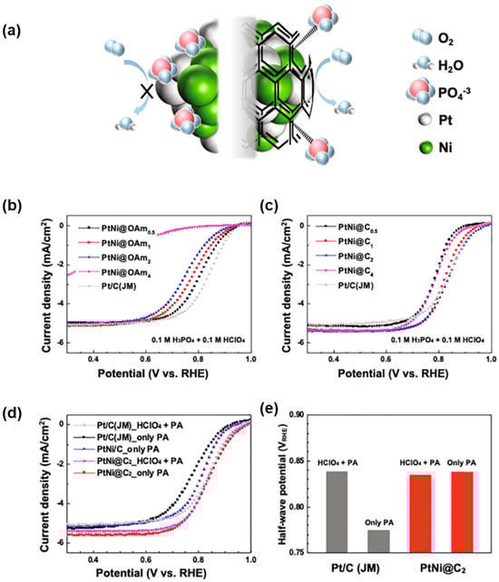 ORR tests with phosphoric acid. (a) Representation of the geometric barrier-induced generation of ORR. ORR LSV curves for the (b) PtNi@OAmx series and (c) PtNi@Cx series in 0.1 M H3PO4 + 0.1 M HClO4. (d) Geometric effect of PtNi@C2 and the effect of PO43− poisoning. (e) Half-wave potential enhancement of PtNi@C2 in only PA. Reproduced with permission. Copyright 2022, Elsevier [60].