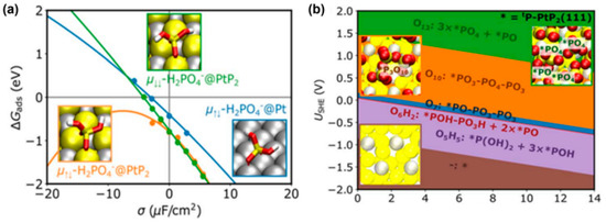 Computational simulations. (a) Adsorption free energy of H2PO4− anions on the (111) facets of Pt and PtP2 as a function of excess surface charge density. (b) The Pourbaix diagram of the surface. The (*) mark indicates the site where each chemical species is adsorbed on the catalyst surface. Reproduced from Ref. [68] with permission from the Royal Society of Chemistry.
